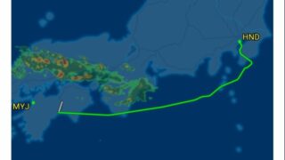 未分類 この機材さっき松山から羽田に飛んできたらしいけどいつも高松空港行くとき姫路上旋回して降りてくもんな、丁度雨雲あるわ! 航路変更で鹿児島行く時みたいなルートで行くんやな