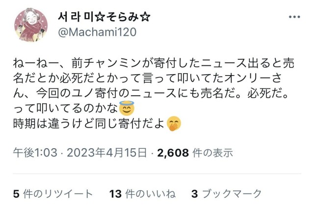 ❷ ?時には有名人としての役割を果たして公に寄付し 時には一般人の中に紛れて人知れず善行を行ない 後に人々の口からその善行が語られるユンホと ?30歳を過ぎて事務所が毎回欠かさず『寄付の広報』をし 自ら高額寄付者の会員証を見せびらかすチャンミンは 同列には語れません。 未分類 X Facebook はてブ LINE コピー 2023.04.17 [Agent_T_CONTENTS]