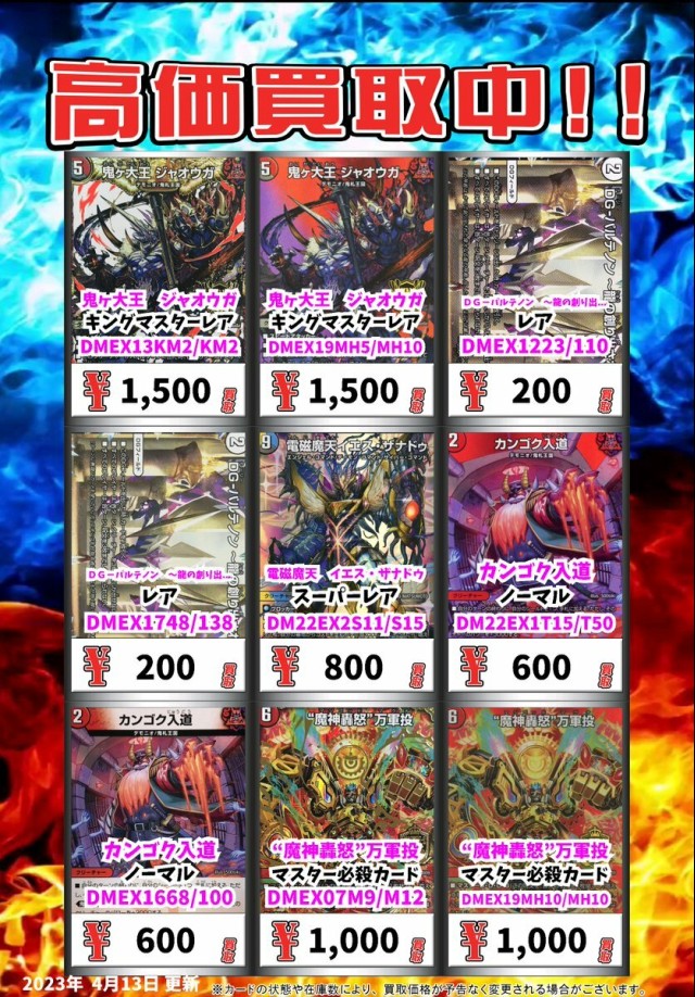 ただいまの超高価買取!! (~4/19まで) デュエマ① 週間買取広告より高いこの機会に ぜひお売り下さい!!! ※一定枚数に達し次第価格変更 ※各種情報により変更の場合があります 未分類 X Facebook はてブ LINE コピー 2023.04.19 [Agent_T_CONTENTS]
