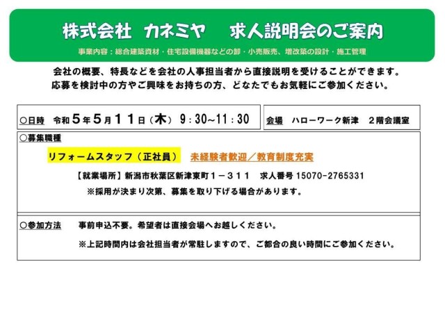 【ハローワーク新津 求人説明会のご案内】5月11日 ★リフォームスタッフ(正社員)の募集です! ★詳しくはチラシにてご確認ください。 未分類 X Facebook はてブ LINE コピー 2023.05.03 [Agent_T_CONTENTS]