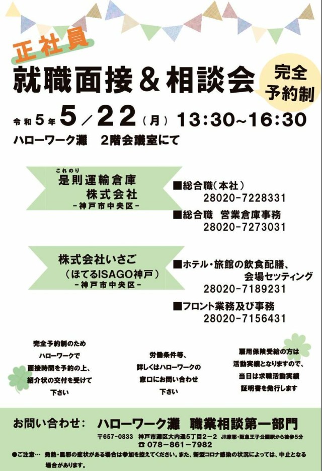 「正社員 就職面接&相談会」のご案内です 日時 令和5年5月22日(月)13:30~16:30 対象 正社員採用を希望する方 場所 ハローワーク灘 2階会議室 参加事業所・是則運輸倉庫株式会社 ・株式会社いさご(ほてるISAGO神戸) 【完全予約制】 ハローワーク灘職業相談第一部門✆078-861-7982 未分類 X Facebook はてブ LINE コピー 2023.05.06 [Agent_T_CONTENTS]