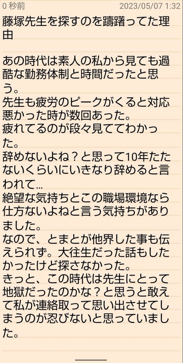 【探してる理由と何故遅かったのか】 先生が辞める時に、新しい勤務先や開業するなら地方でも他県でも応援するのでハガキとかでいいから知らせてくださいね、と言ってたのに連絡くれませんでした。 なので、あの頃の時代を思い出したくないのではととまとの他界時に踏み切れませんでした。 未分類 X Facebook はてブ LINE コピー 2023.05.08 [Agent_T_CONTENTS]